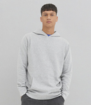 90% organic cotton/10% viscose. Soft peached fabric with brushed inner. Drop shoulder style. Fashion fit. Hood with no drawcord. Taped neck. Front pouch pocket. Ribbed angled cuffs and hem. Unbranded size label.