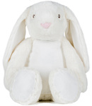 100% polyester. Soft plush bunny. Floppy ears. Sewn eyes. Contrast pink nose on cream bunny. White coloured panel on tummy and feet. Removable inner pad (body only). Zip access for decoration onto front panel. Suitable for embroidery, print and sublimation.